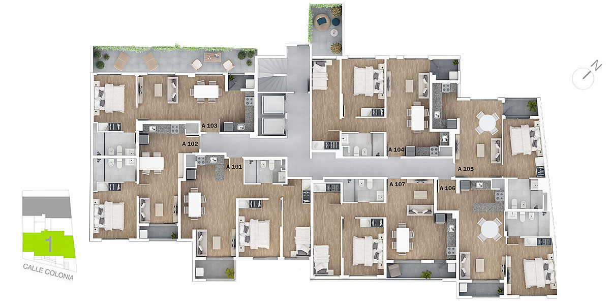 ONN BE HACHE está formado por dos edificios totalmente independientes. BE HACHE COLONIA está ubicado en Colonia 2189 y cuenta con: subsuelo con cocheras, planta baja con locales comerciales, 10 pisos de apartamentos y una planta de amenidades íntegramente equipada. • Ambos edificios cuentan en forma privada con: Salón multiuso con barbacoa, cocina, sanitarios y vista panorámica en último piso. • Gimnasio. • Piscina y solarium.